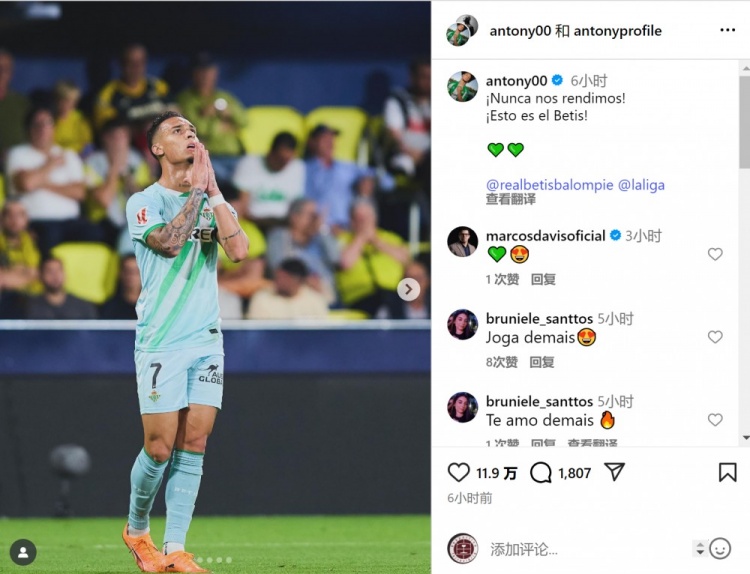 梅开二度+补时绝平!安东尼社媒:我们永不言弃,这就是贝蒂斯