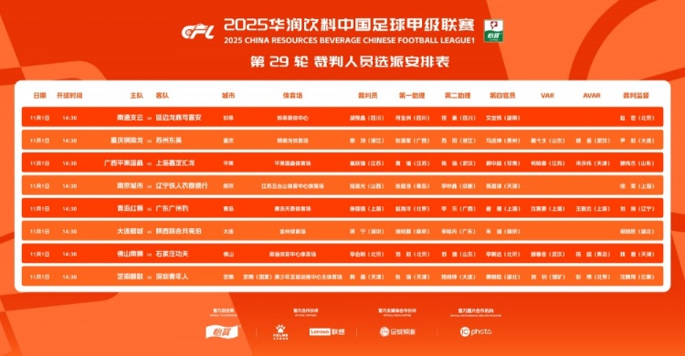 2025-11-01 16:04:16中甲第29轮裁判:邢琦吹重庆铜梁龙vs苏州东吴,5场比赛设有VAR