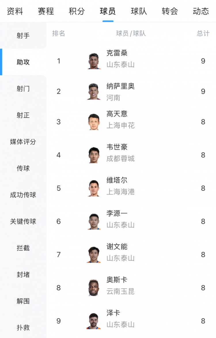 中超助攻榜:克雷桑和纳萨里奥9次并列第一,韦世豪等7人8次